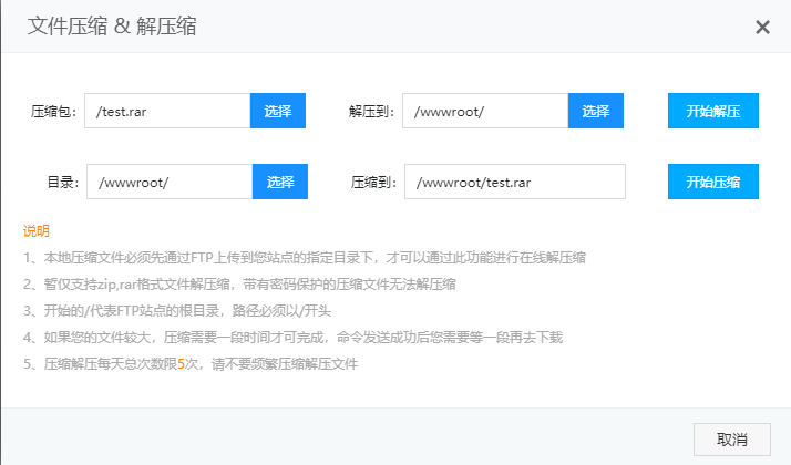 说明当您需要对FTP空间内的文件进行压缩或解压时,请使用 “文件压缩/解压” 功能。