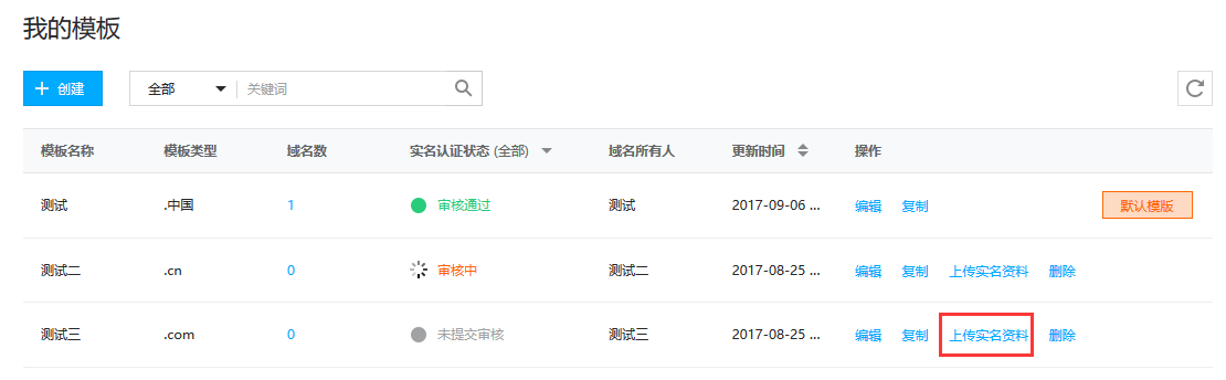 选择需实名认证的模板,点击上传实名认证资料。