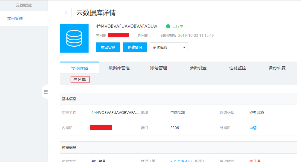 创建云数据库实例后,您需要设置实例的白名单,以允许外部设备访问该云数据库实例。 操作步骤: 1.登录控制台->云数据库->管理云数据库实例。 ![]() 2. 找到需要设置白名单的目标实例,单击管理
