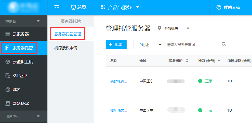 1. 登录,控制台->服务器托管->服务器托管管理。