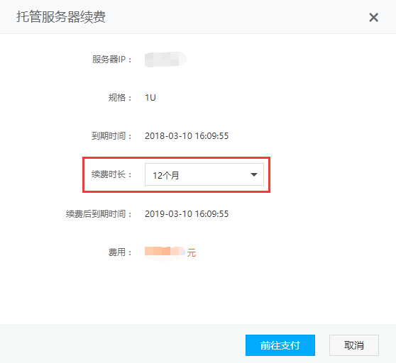 2. 选择您需要续费的托管服务器,点击续费,或进入服务器管理页的付费信息中点击续费操作。