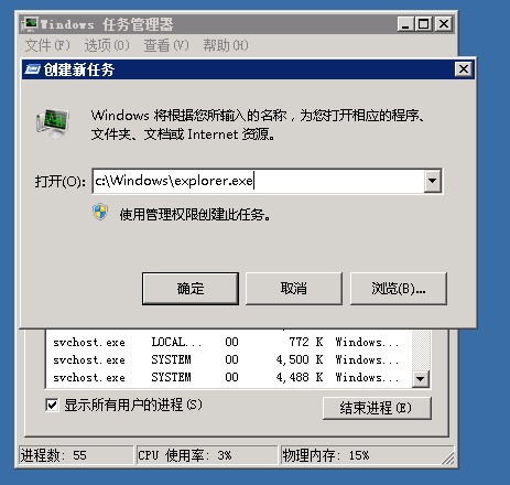 远程连接并登录服务器到达蓝屏界面。 ![]() 按本地电脑键盘的ctrl+alt+end——点击启动任务管理器。 ![]() 在任务管理器上点击文件——新建任务。 ![]() 输入c:\Windows\explorer.exe——点击确定。 ![]() |